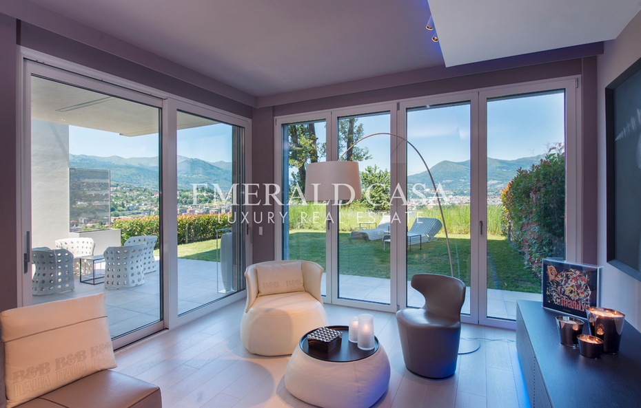 The living area, consisting of a kitchen island and dining area, opens onto a large living room with direct access to the beautiful panoramic garden-terrace, ideal for enjoying the breathtaking view of the lake.