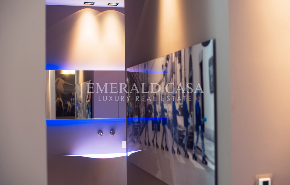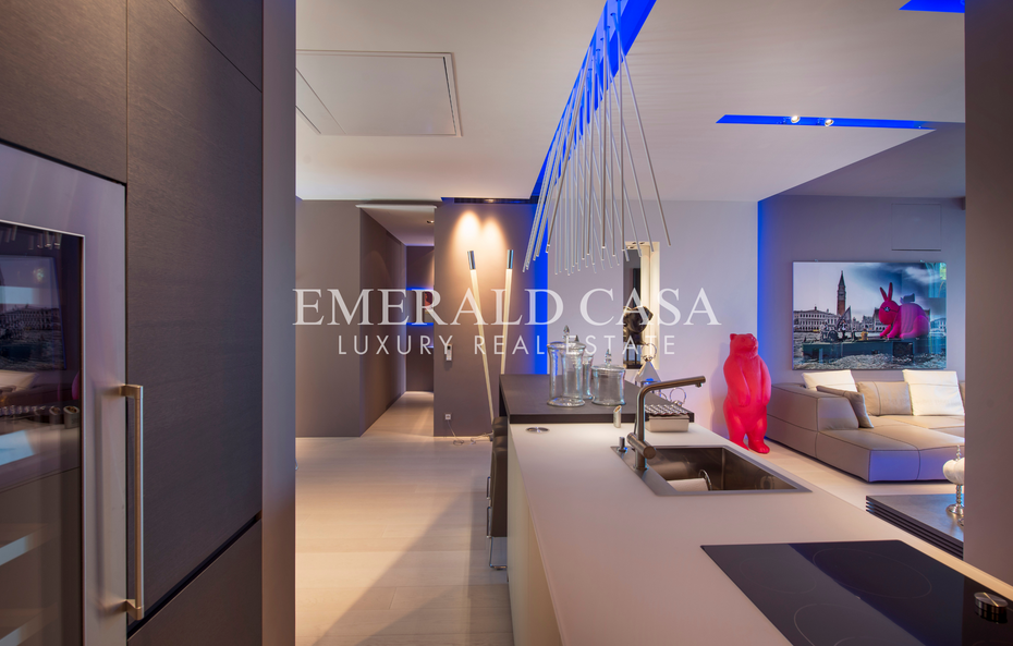 The apartment has been designed with high-quality materials and exclusive finishes, including parquet floors, innovative lighting, designer furnishings and large windows that flood the spaces with natural light.