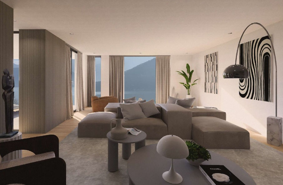 La cucina, firmata Ernesto Meda, è il cuore della casa, progettata per vivere la cucina come spazio di eleganza e praticità. Il soggiorno open space, luminoso e spazioso, si apre su una loggia panoramica, mentre gli altri ambienti si affacciano su piccoli spazi esterni che permettono di godere del sole e della vista lago in totale privacy.